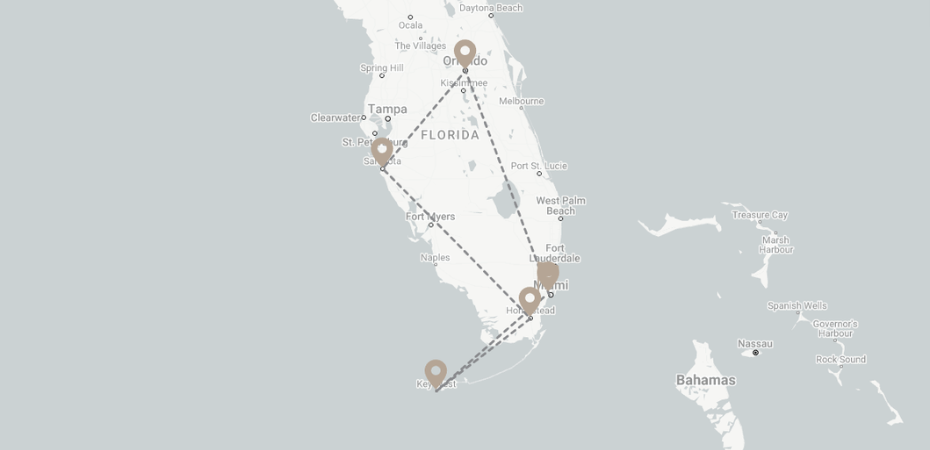 Nei giorni successivi, il tour si sposta verso Orlando, una delle mete più iconiche per il divertimento in famiglia. A Orlando, la magia di Walt Disney World o l’adrenalina delle Universal Studios ti faranno vivere giornate indimenticabili. Il percorso continua con una tappa a Sarasota, dove l’arte, la cultura e il fascino storico del complesso The Ringling e della storica Ca D’Zan – l’antica dimora di un magnate del circo – si fondono in un’atmosfera raffinata e suggestiva. Le Sarasota Keys, con le loro residenze di lusso e spiagge di sabbia chiara, offrono un’ulteriore nota di eleganza.