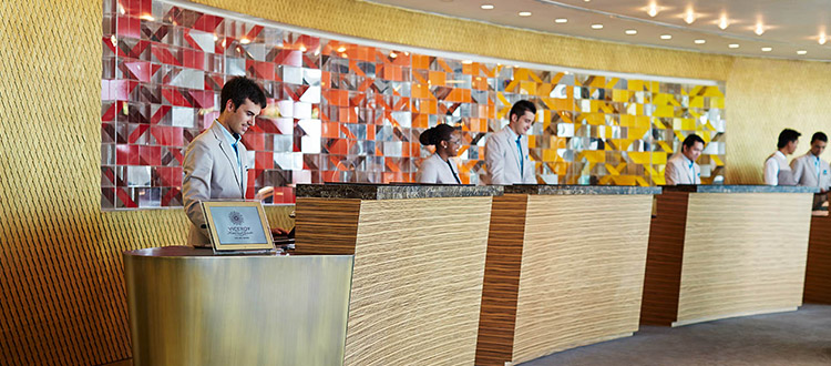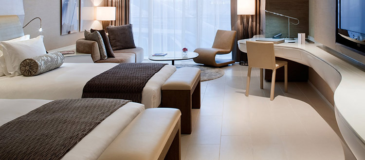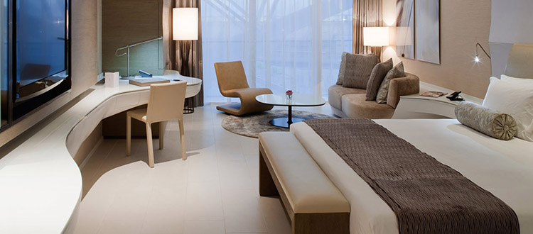 Anche all'interno di questo spettacolare hotel, grande importanza è stata data alle luci colorate, che creano atmosfere del tutto particolari; gli ambienti di questo hotel sono espressione di lusso e raffinatezza, grazie alla presenza di materiali di pregio e alle linee sinuose di superfici e arredi.