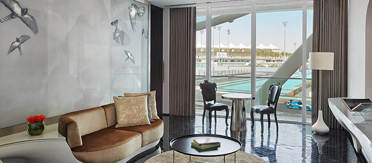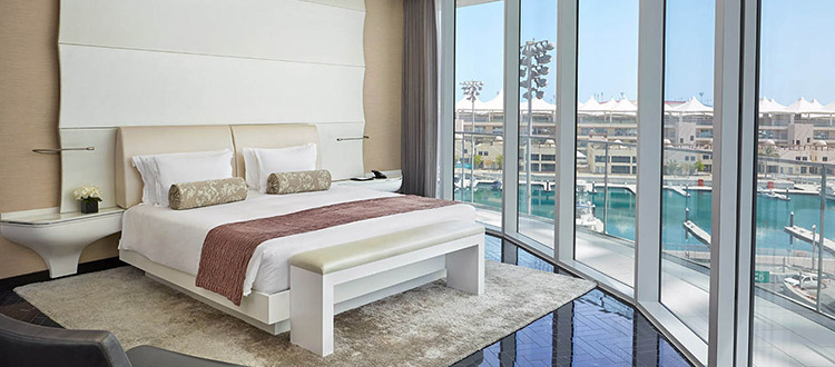 L'illuminazione e tendaggi sono comandati a distanza. La struttura è suddivisa in 499 tra camere e Suite: 252 Deluxe Rooms, 71 Marina Deluxe Rooms e 101 Executive Rooms, tutte di circa 60mq (le ultime due si differenziano per essere ubicate nella Marina Tower), 13 Deluxe Suites e 37 Executive Suites di circa 100mq, ubicate nella Main Tower e con meravigliosa vista sull'Isola e sul Marina Circuit, 13 Yas Grand Suites di circa 110mq, collocate agli ultimi piani della Executive Tower, anch'esse con meravigliosa vista sul circuito e sull'isola. 10 tra Island e Marina Executive Suites di 145mq; per finire due meravigliose e superbe Presidential Suite, di circa 600 mq, con accesso privato per chiedere il massimo in ordine di privacy ed eleganza.