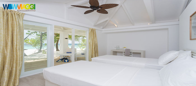 Camere Il resort offre agli ospiti due tipologie di camere: 46 beach bungalow completamente rinnovati in un elegante mix di modernità e stile tipico maldiviano, dove domina il bianco, distribuiti sul perimetro esterno dell’isola e affacciati direttamente sul mare (massima occupazione 2 adulti e 1 bambino o 3 adulti); 24 water bungalow accessibili da un pontile in legno, dispongono di letto matrimoniale e divano letto (massima occupazione 3 adulti e 1 bambino o 4 adulti) e di una terrazza attrezzata con lettini. Nei water bungalow i bambini sono ammessi a partire dagli 8 anni. Tutte le camere sono dotate di aria condizionata, servizi privati con doppio lavabo, doccia (in stile “maldiviano” nei beach bungalow), asciugacapelli, telefono, cassetta di sicurezza, set per la preparazione di tè e caffè all’americana, minifrigo rifornito giornalmente di acqua minerale, veranda attrezzata e connessione Wi-Fi.