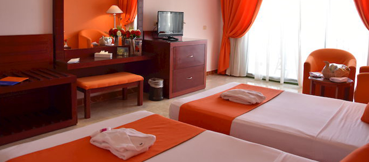 Camere La struttura si sviluppa intorno alla grande piscina centrale, con diversi edifici immersi in curatissimi giardini. Le 255 camere standard (46 m2 circa) possono ospitare fino a un massimo di 2 adulti + 2 bambini o 3 adulti + 1 bambino; l'hotel dispone inoltre di 50 camere superior (46 m2 circa), situate al secondo piano, con arredi di pregio e vista mare che possono ospitare fino a un massimo di 2 adulti + 2 bambini o 3 adulti + 1 bambino. Per necessità di spazi più grandi sono disponibili (su richiesta) un numero limitato di camere che possono ospitare 5 persone (3 adulti + 2 bambini), di quadruple (60 m2 circa) e di comunicanti (solo su segnalazione e confermabili una volta in loco solo se disponibili). Al loro interno le camere sono spaziose e dispongono di servizi privati con doccia, asciugacapelli, climatizzatore regolabile, TV satellitare con canali italiani, cassetta di sicurezza, telefono, bollitore per la preparazione di tè e caffè all’americana, una bottiglia di acqua da un litro e mezzo al giorno, balcone o terrazzo. A pagamento: servizio in camera 24 ore al giorno e minibar. Nell'ala Deluxe, elegante e riservata solo alla clientela adulta a partire dai 16 anni compiuti, si trovano 106 camere deluxe e 4 presidential suite. Le deluxe sono spaziose (46 m2 circa), dotate di area soggiorno e dispongono di un letto matrimoniale e di un divano letto (massimo 3 persone; sono presenti 2 camere di maggiori dimensioni in grado di ospitare 4 persone). Oltre a quanto indicato per le camere standard, i clienti sistemati nelle deluxe dispongono di accappatoio e pantofoline da camera, cesto di frutta all’arrivo e minibar rifornito di birra e soft-drink all’arrivo. Le presidential suite sono estremamente lussuose e spaziose (92 m2 circa), composte da camera da letto, ampio salone e 2 terrazze panoramiche e dispongono inoltre di idromassaggio a due posti con vista sul mare (massima occupazione 2 persone, disponibilità su richiesta). Per tutti gli ospiti late check-out libero, soggetto a disponibilità, e formula tutto incluso fino all’ora di partenza.