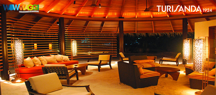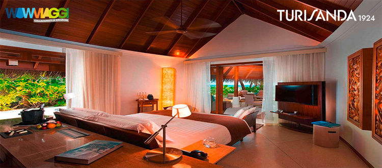 Camere Le esclusive sistemazioni sono suddivise in 57 water villa di 100 mq di cui 20 family water villa tutte direttamente sul mare, collegate da pontili e con piscina privata. Inoltre 20 beach villa di 350 mq di cui 11 family beach villa, 9 ville a un piano, 8 ville a due piani di 410 mq ubicate sulla spiaggia, tutte con piscina privata e una prestigiosa villa presidenziale di 700 mq. Le family beach villa ospitano fino a 2 adulti e 2 ragazzi sino a 13 anni. Tutte le ville sono arredate con gusto contemporaneo in perfetto equilibrio tra lusso e sobrietà, con utilizzo di materiali di pregio come legno e marmo. Sono dotate di area soggiorno e sala da bagno con vasca e doccia esterna per le beach villa. Nelle water villa la doccia è interna. Connessione internet tramite wifi o smart tv. Un tocco particolare: non solo un minibar, ma anche una piccola cantina con all’interno una selezione di vini.