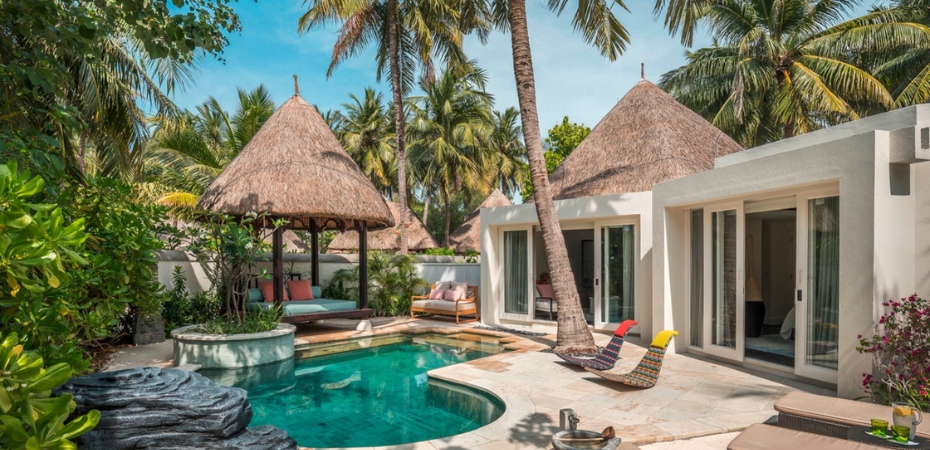 Camere Pavilion e bungalow dai tradizionali tetti ricoperti da foglie di palma si susseguono su una spiaggia di sabbia bianchissima al Four Seasons Resort Maldive di Kuda Huraa, mentre i bungalow overwater sono eretti sulla laguna.