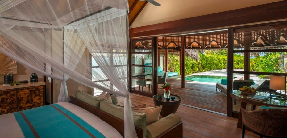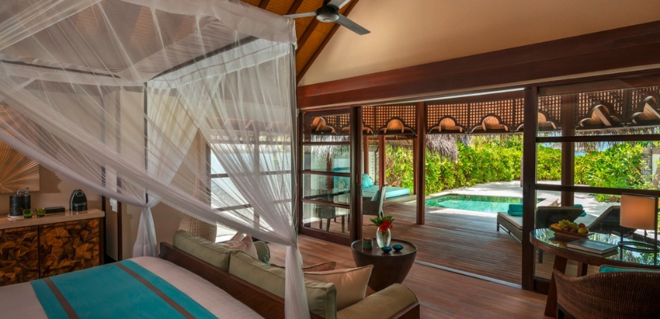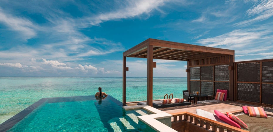 Direttamente sull’acqua, i water bungalow (61 mq) hanno soggiorno e sala da bagno che si aprono verso il solarium esterno riparato alla vista.