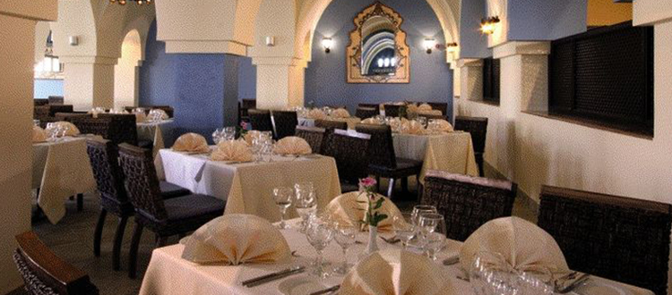 Al-Diwan, ristorante principale con terrazza sulla baia, per prima colazione, pranzo e cena con servizio a buffet, menù vegano e alcuni angoli di cucina dal vivo; serate a tema. Il Sabbar, sulla spiaggia, funge da snack bar e bar durante il giorno, alla sera si trasforma in ristorante à la carte a pagamento (incluso una volta per soggiorno, su prenotazione). Sempre a pagamento (inclusi una volta per soggiorno, su prenotazione), sono disponibili altri tre ristoranti à la carte del Souk di Medinat Coraya Resort, l’area del mercato situata alle spalle dell’hotel: Nino, specializzato in cucina italiana, Sofra in quella Medio Orientale, Momo in quella asiatica, Sea Horse con piatti di pesce. Cenoni di Natale e Capodanno inclusi.