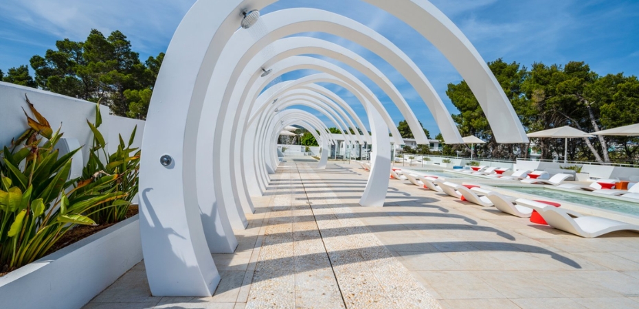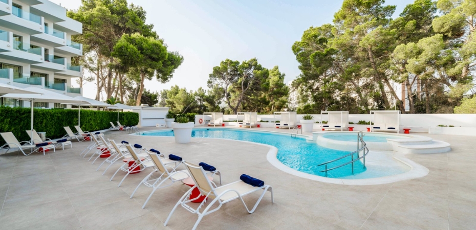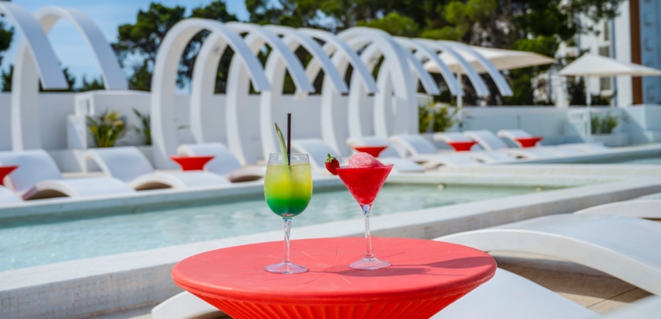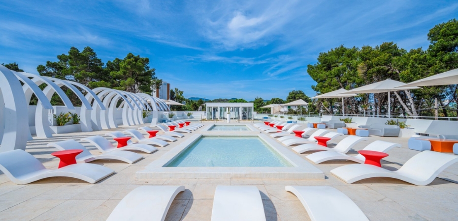 Spiagge e piscine Dista pochi minuti a piedi dalla spiaggia di Es Pouet, la più lunga della baia di San Antonio. L'hotel dispone di piscina e ampie terrazze con zona chill out dalle quali è possibile ammirare i famosi tramonti di Ibiza. Utilizzo di ombrelloni, lettini e teli mare solo in piscina.