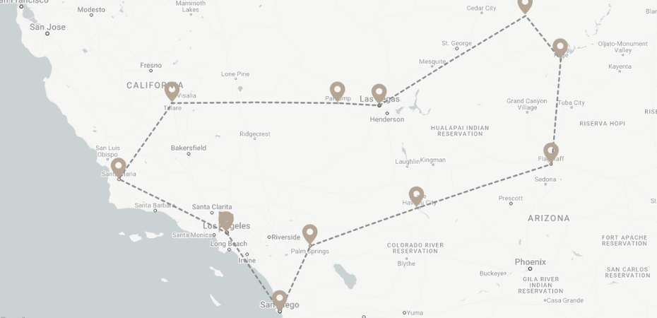 Il tour continua poi verso i parchi naturali più spettacolari: Bryce Canyon, con i suoi anfiteatri di roccia rossa, e Monument Valley, prima di dirigerti verso il Grand Canyon, simbolo dell’immensità della natura americana. L’itinerario prosegue lungo la storica Route 66, portandoti a Lake Havasu, una città vibrante sulle rive di un lago scintillante, e successivamente a Palm Springs, rinomata per il suo fascino retrò e per essere stata l’ex rifugio dei divi di Hollywood.